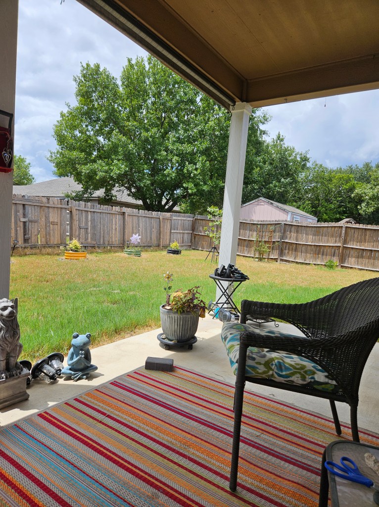 Sitting on my back patio, this first day of September. The heat here in Texas this summer has been rough on grass and plants, my raise bed shrubs, I planted in April some made it, and some ๐Ÿ˜ž.